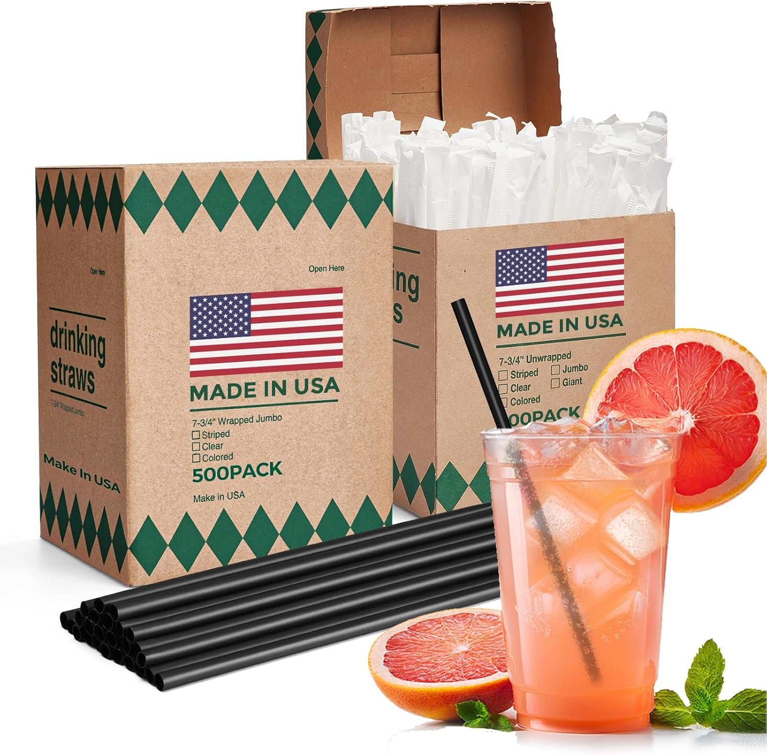 - Quantity & Packaging: 1000 black disposable plastic straws (2 boxes of 500), each individually wrapped in a paper sleeve for sanitation and easy use.