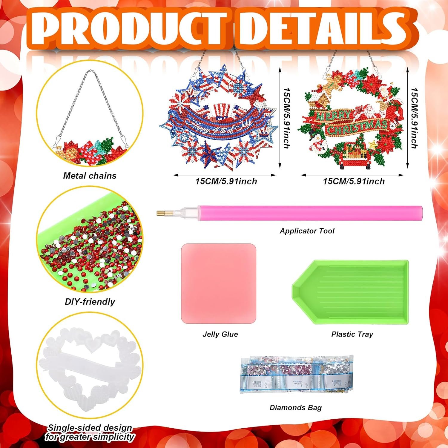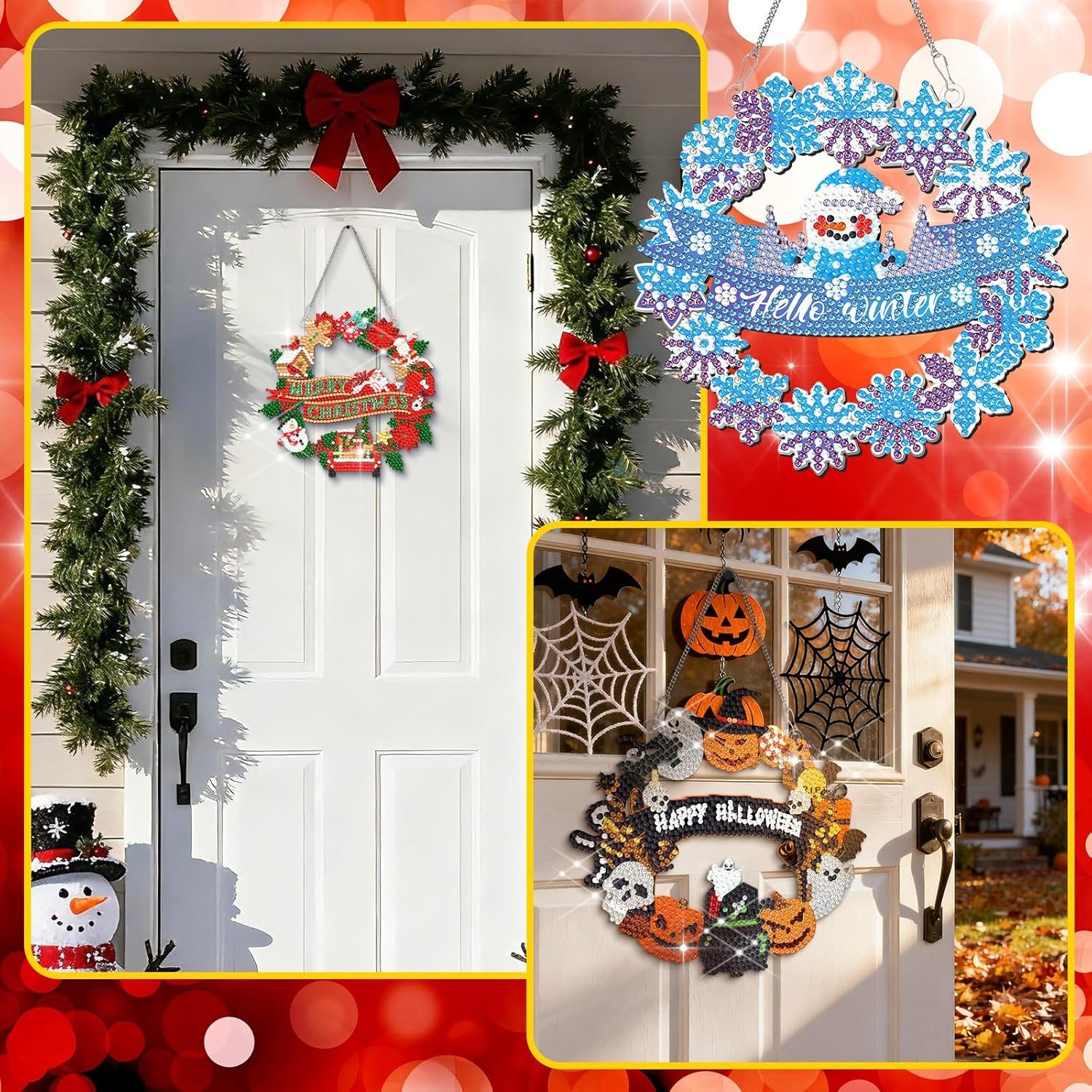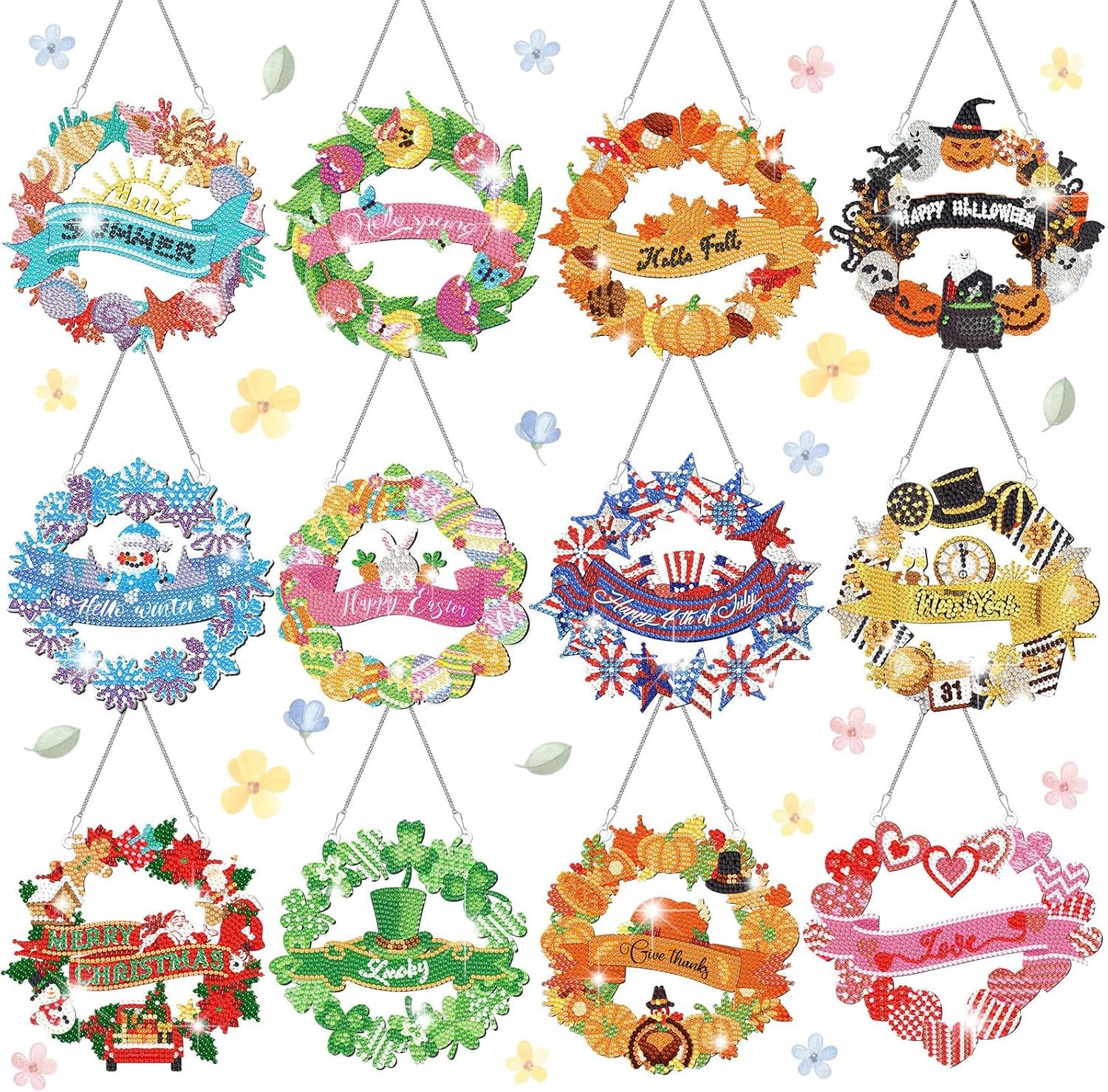 Complete Seasonal Diamond Art Kits: Includes 12 DIY holiday wreath kits with tools, decorations, and chains, offering multiple creative options. Each kit features unique festival designs for gifting or personal crafting.