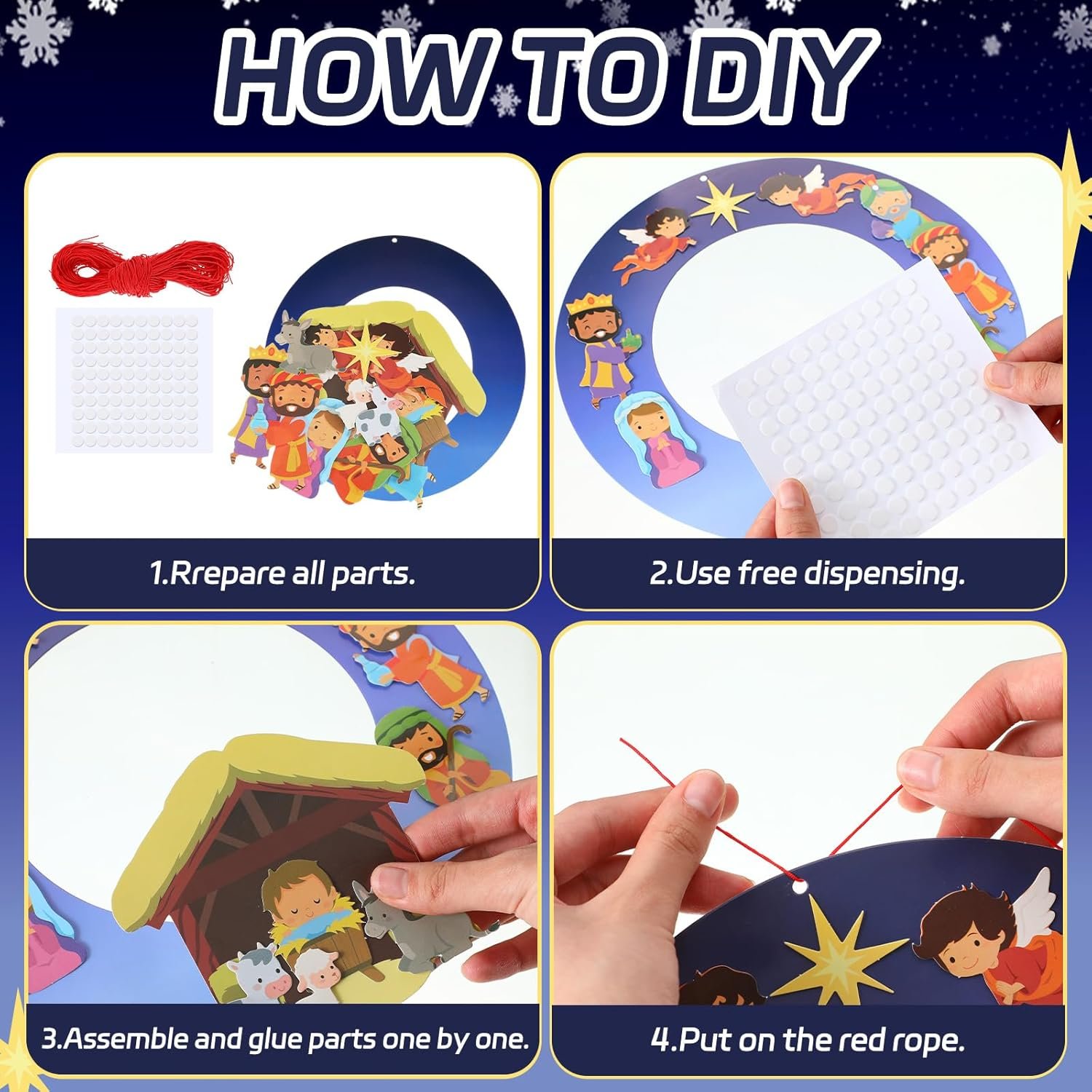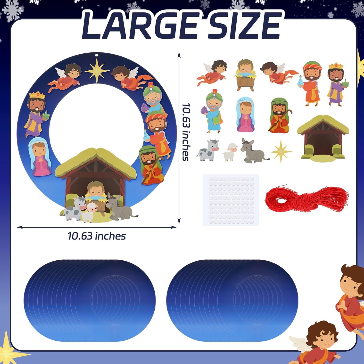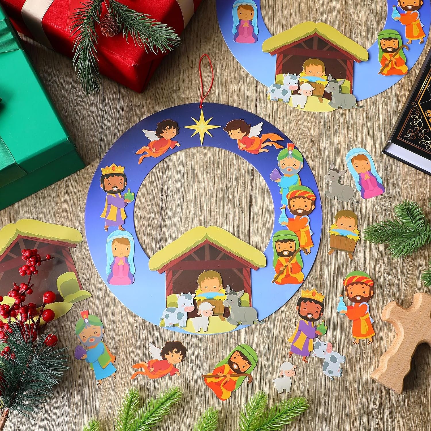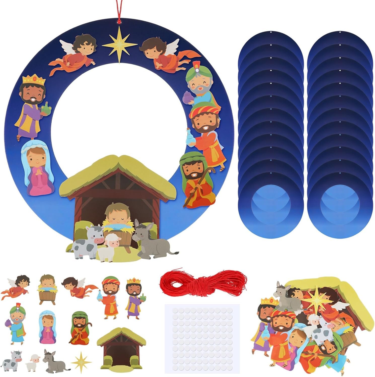- Complete Craft Set: Includes 24 nativity wreath kits, 500 adhesive dots, and enough ropes for group or individual DIY Christmas projects. Made from durable cardboard for easy crafting.