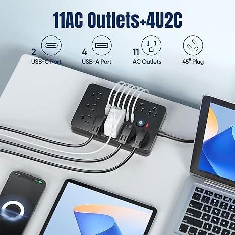 More Thoughtfully For Use: With 4 centrally positioned USB ports & 2 USB-C ports, alongside 11 AC outlets strategically placed around the edges. This scientific configuration ensures optimal utilization of each socket, accommodating a wide array of devices seamlessly.