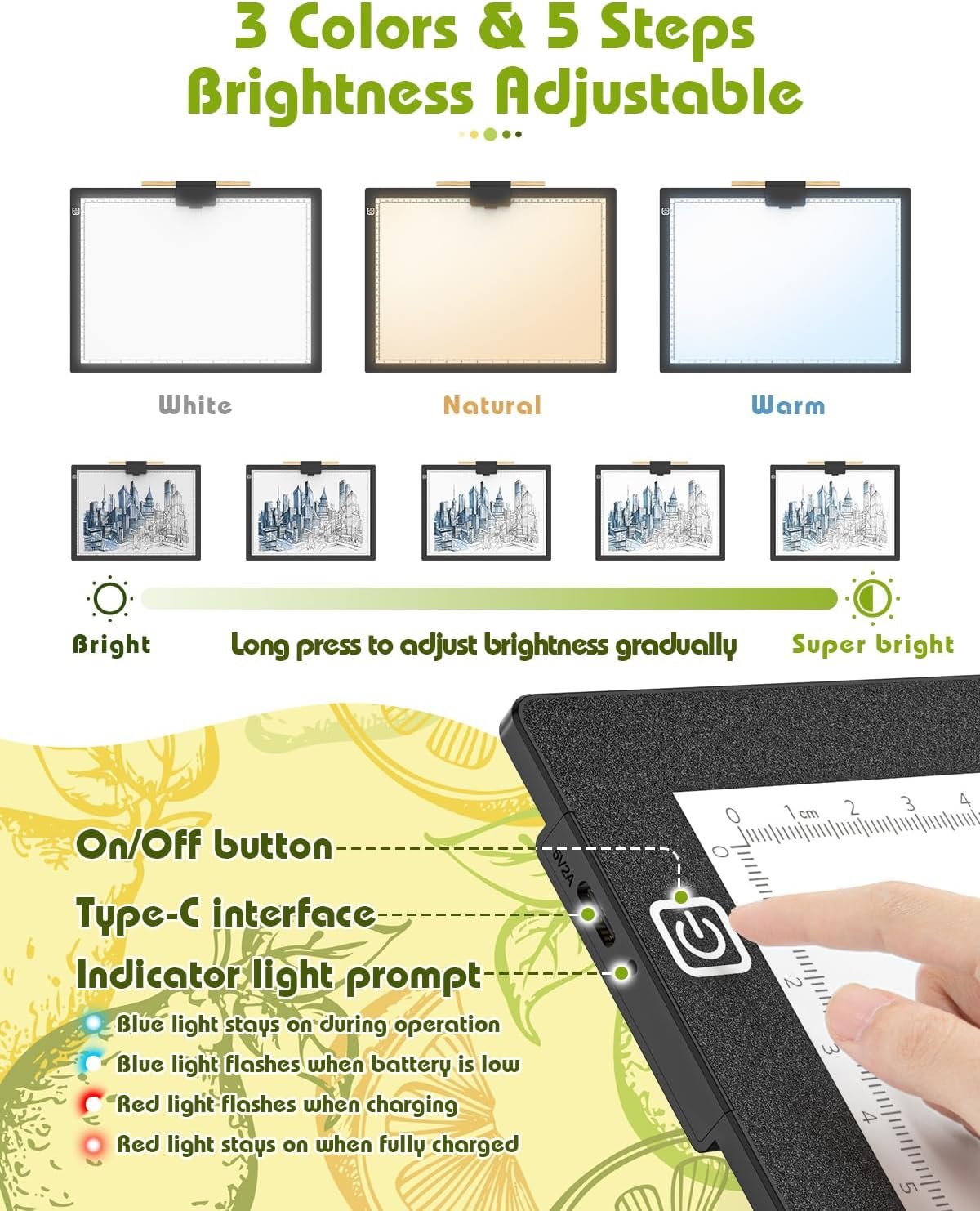 Dimmable & Eye-Friendly: Three-color dimmable light with flicker-free, heat-free panel protects eyes while providing optimal illumination for tracing or painting.