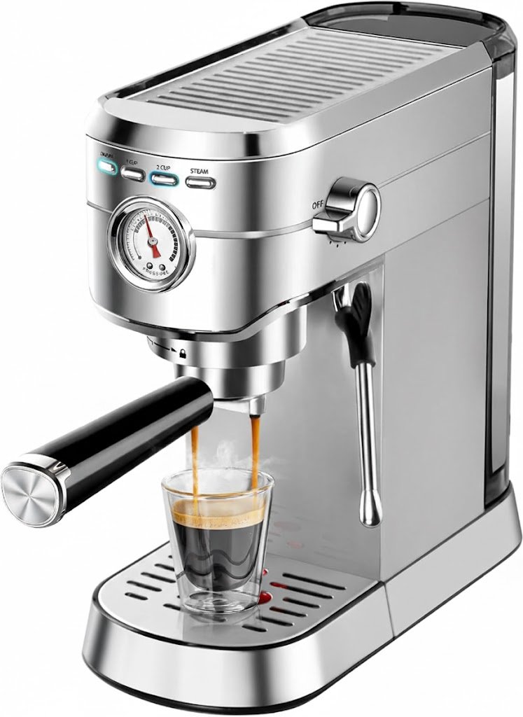 • Professional 20-Bar Pressure System: Semi-automatic espresso maker with a 20-bar Italian pump and 1350 W boiler ensures rich aroma and flavor; built-in pressure gauge allows personalized adjustments for perfect extraction.