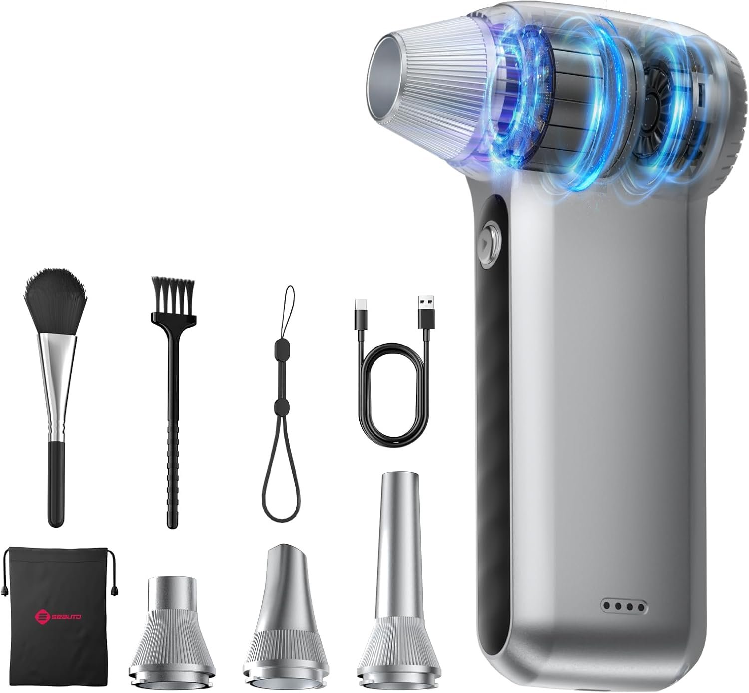 6-in-1 Multi-Purpose Cleaning Kit: Equipped with 4 precision nozzles and 2 detachable brushes, this versatile air duster handles virtually any cleaning task. Deep-clean keyboards, PCs, and cameras; remove dust from car vents and furniture; clean camping gear or firewood ash — even sweep leaves from patios.