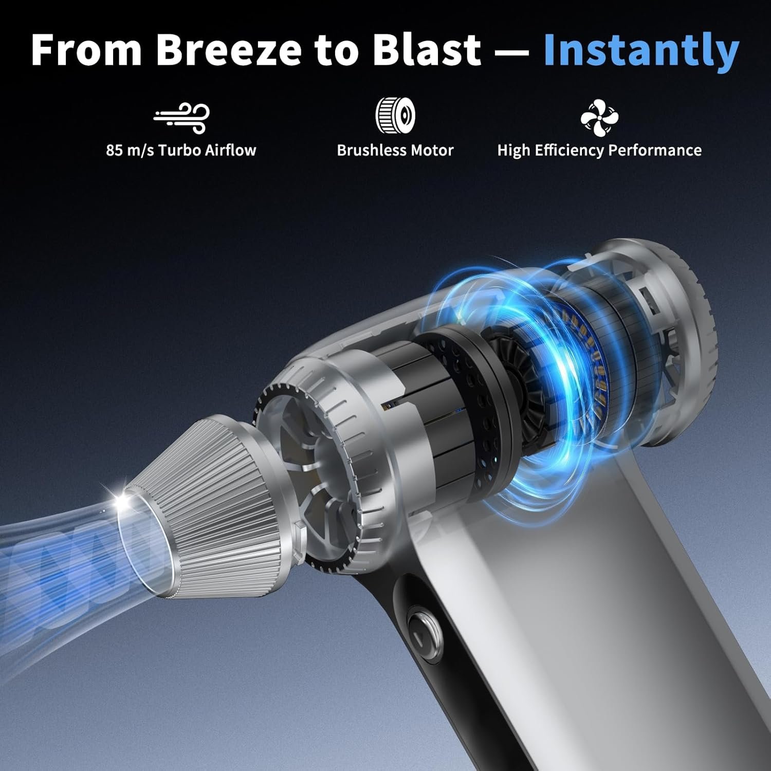 200,000RPM Brushless Turbo Motor — Power Beyond Limits: Experience next-level performance with our advanced 200,000RPM brushless motor, delivering an ultra-high wind speed of 85 m/s. Concentrated, high-velocity airflow removes stubborn particles instantly — without physical contact, moisture, or residue.