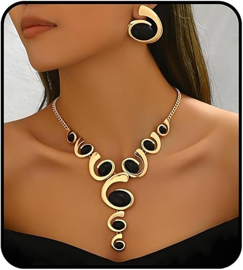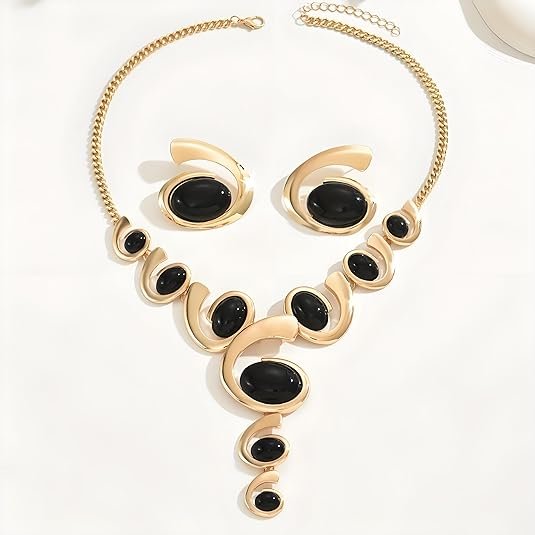 Gold Jewelry Set: Smooth black inlays paired with radiant gold-tone alloy create a vintage yet modern look. Bold design perfect for casual or formal outfits.