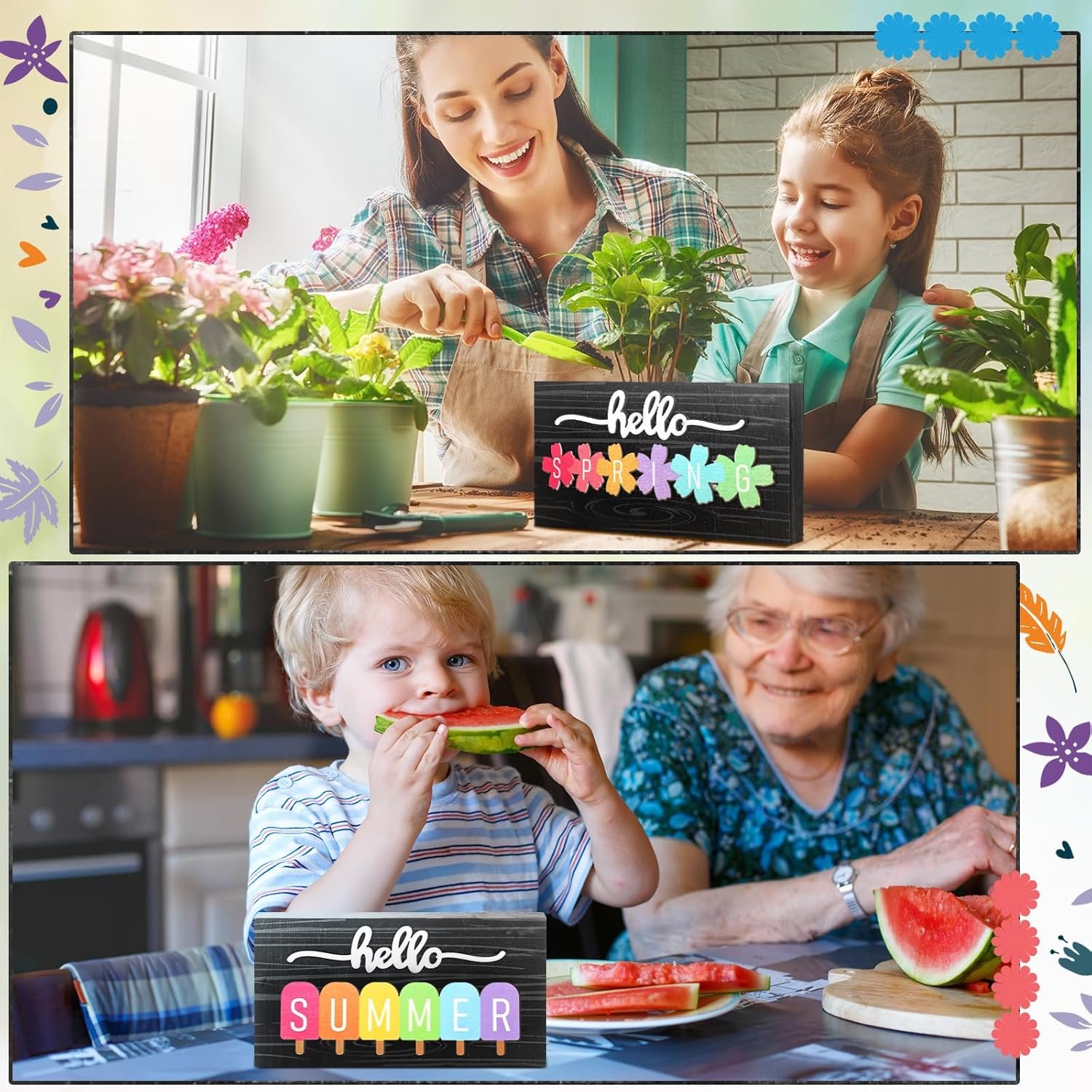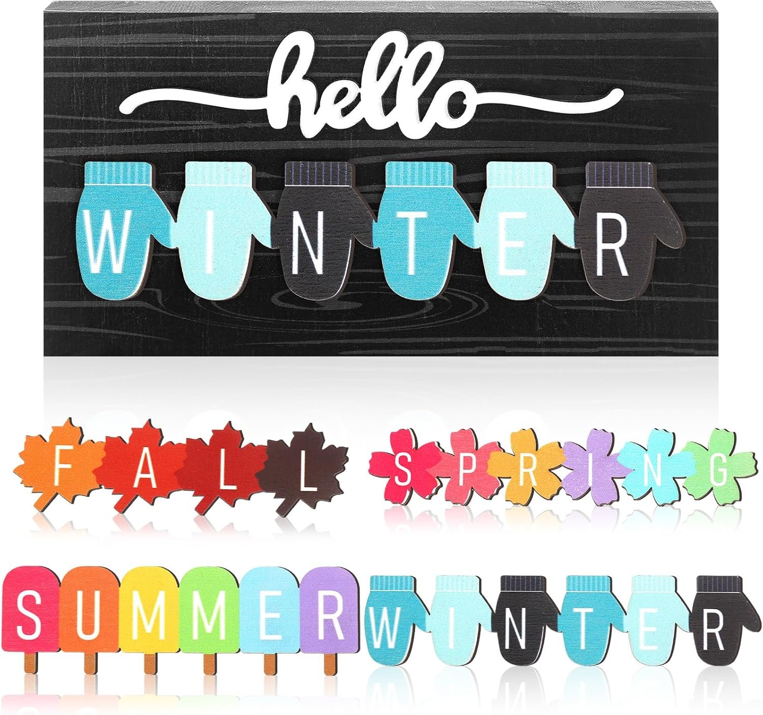 Creative Seasonal Design: Each sign captures the essence of its season—flowers for spring, ice cream for summer, maple leaves for fall, and gloves for winter—bringing novelty and cheer to any space.