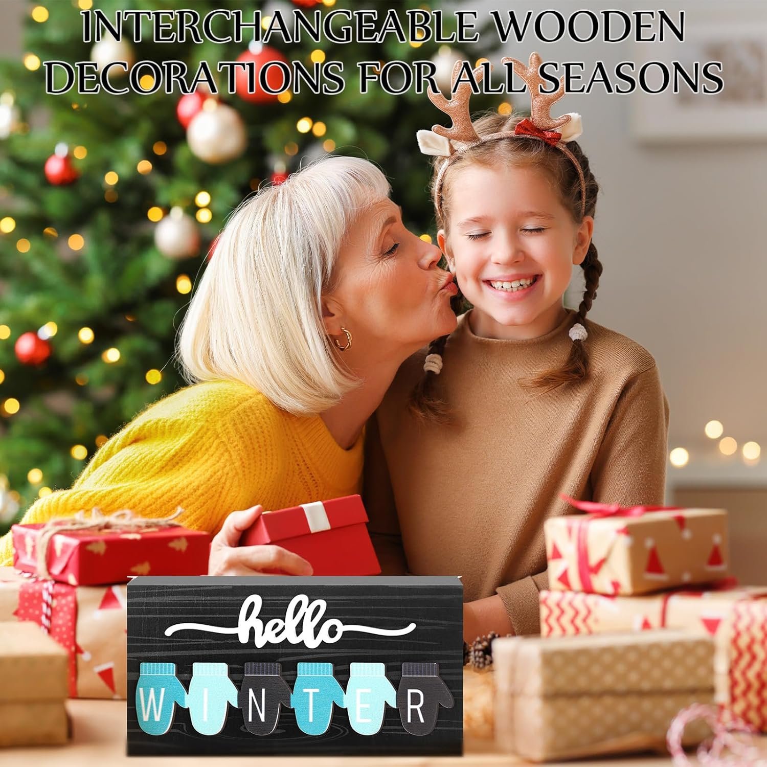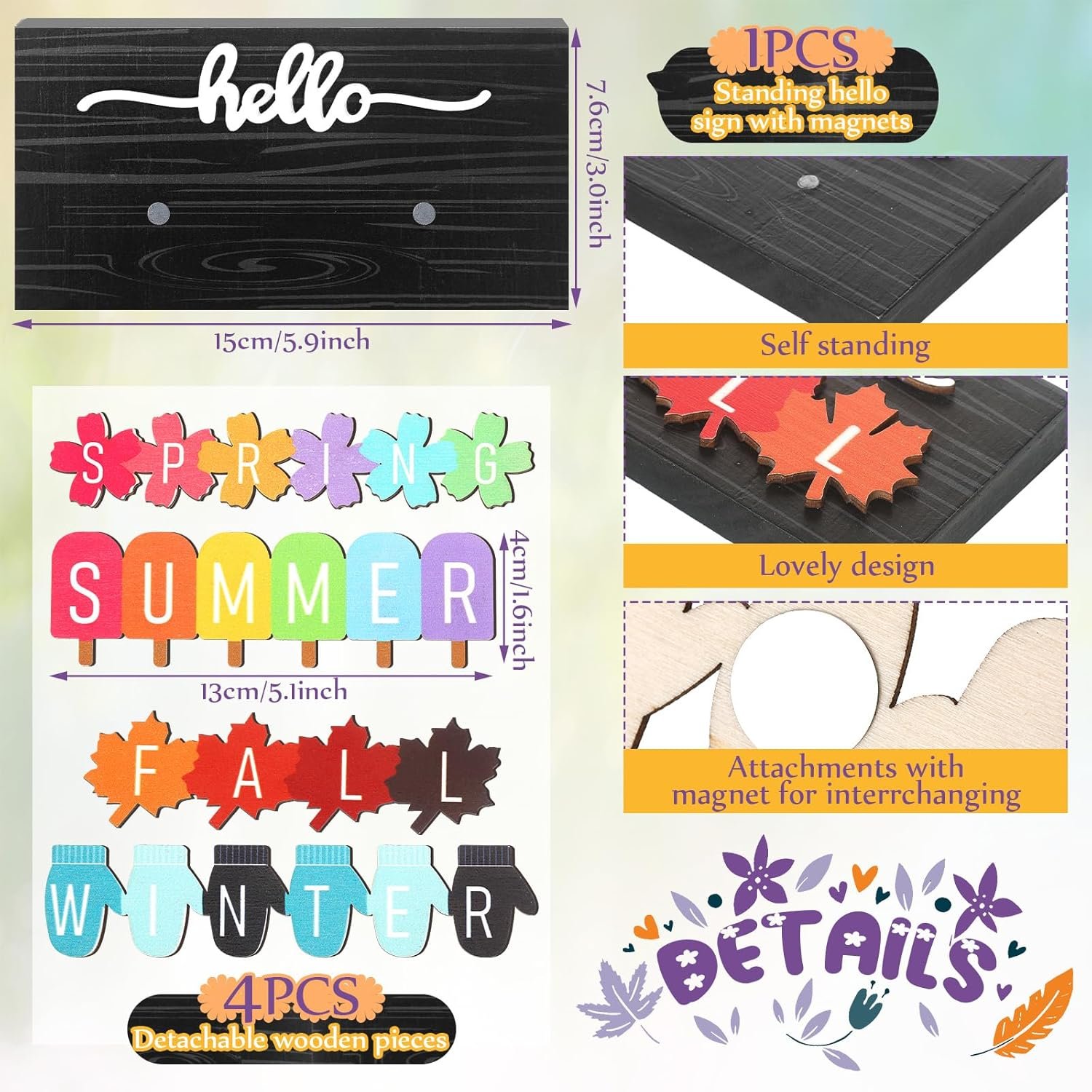 Charming Seasonal Decor: This set includes 1 wooden block with the word “Hello” and 4 interchangeable seasonal signs featuring spring, summer, fall, and winter designs. Suction stones make swapping the accessories quick and easy, adding both fun and practicality to your home.