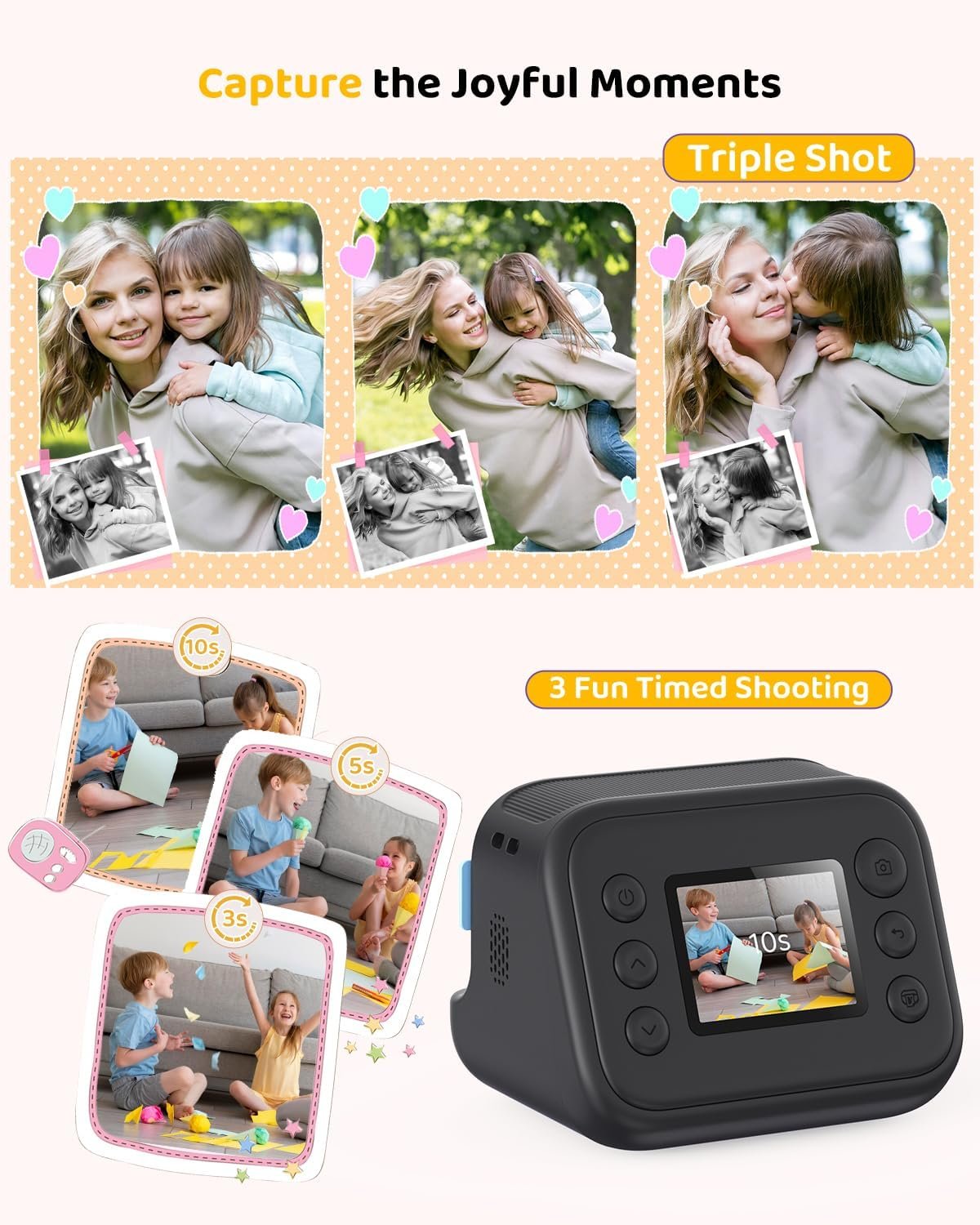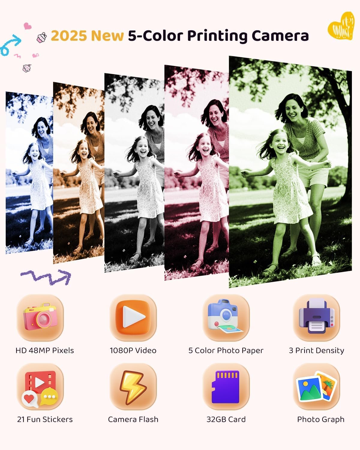 Color Instant Printing: Prints photos in blue, green, red, orange, and black and white using safe thermal technology