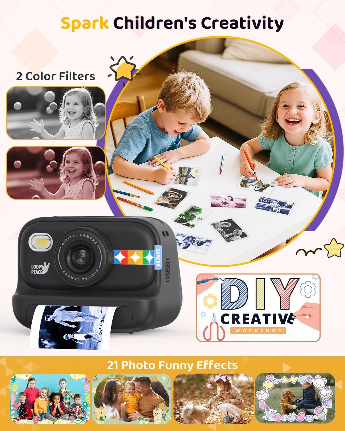 Creative Photo Effects: Includes 21 fun frames, comic mode, color filters, and adjustable print density options