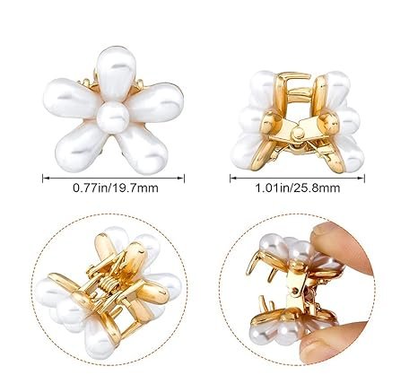• Sweet & Elegant Style: White artificial pearls shaped like daisies on golden claw clips add charm and sophistication to any outfit.