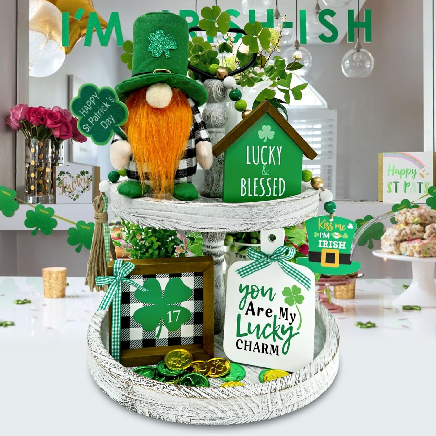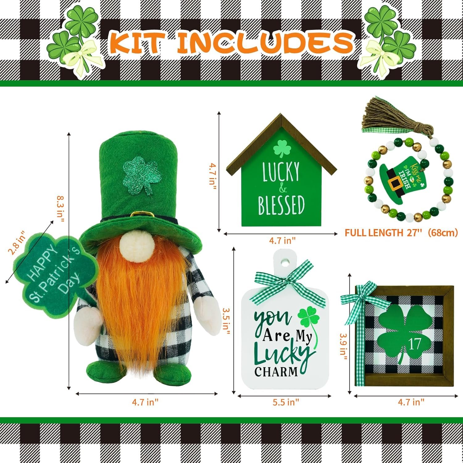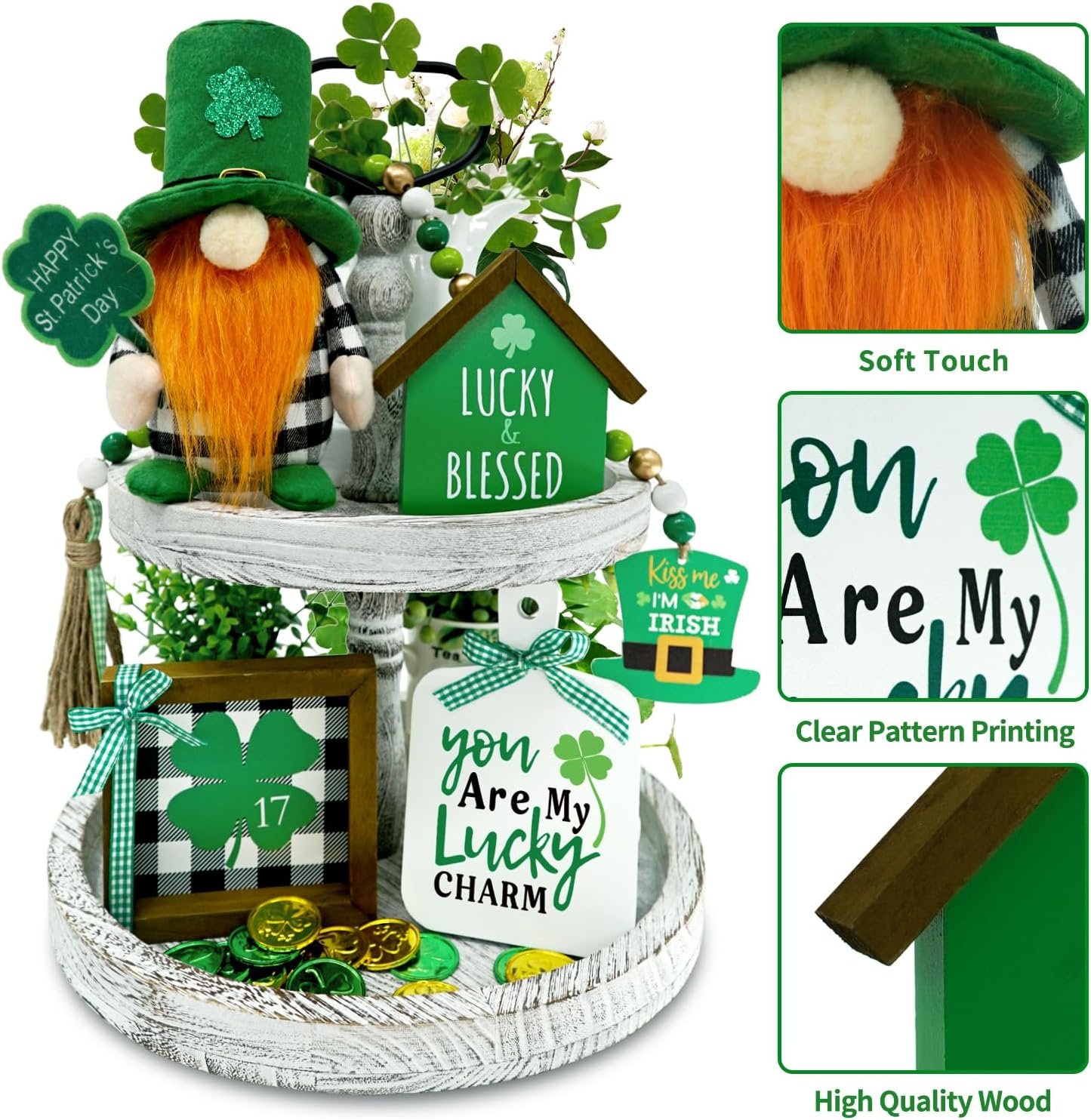 • Complete St. Patrick’s Set: Includes 1 green buffalo plaid gnome plush, 3 mini wooden signs, and 1 wood bead garland—perfectly packaged in a gift-ready box (tiered tray not included).