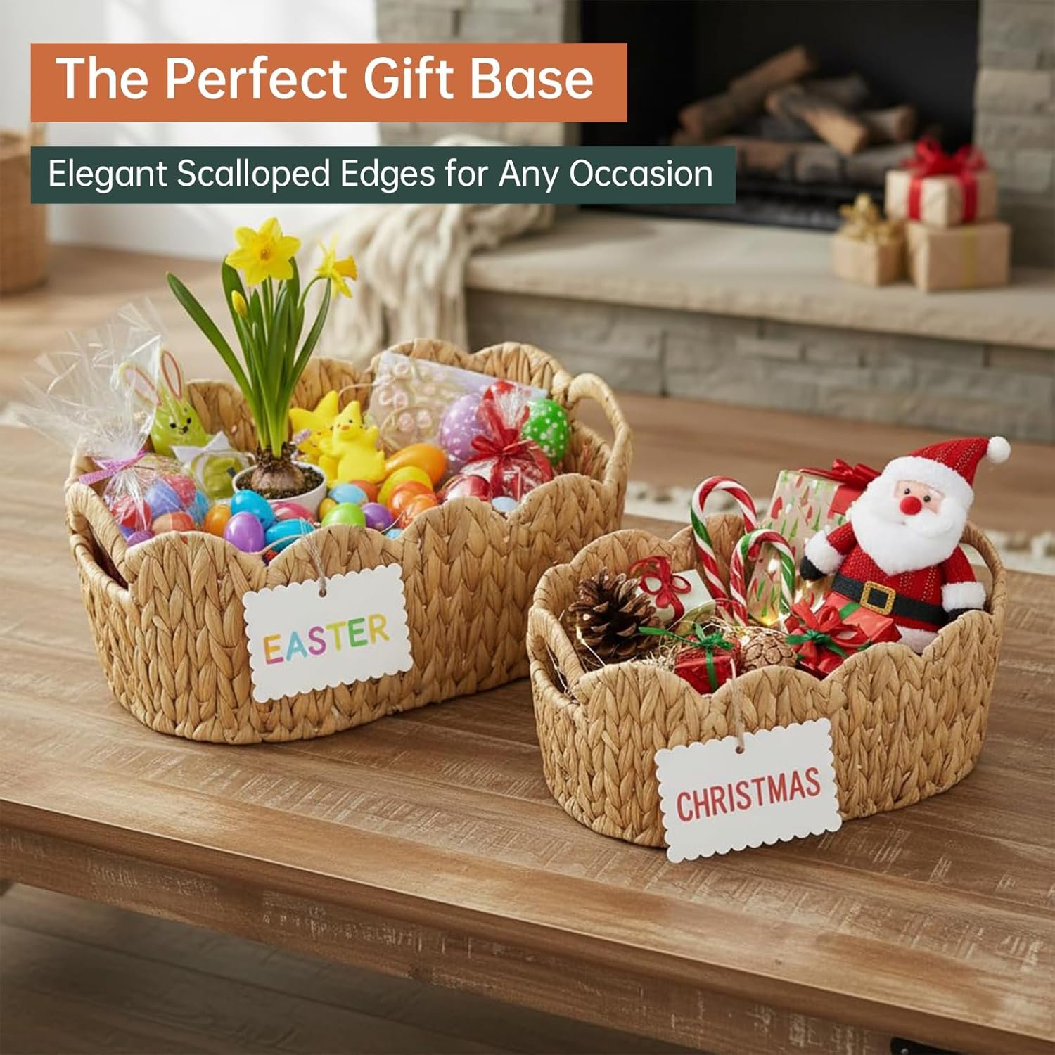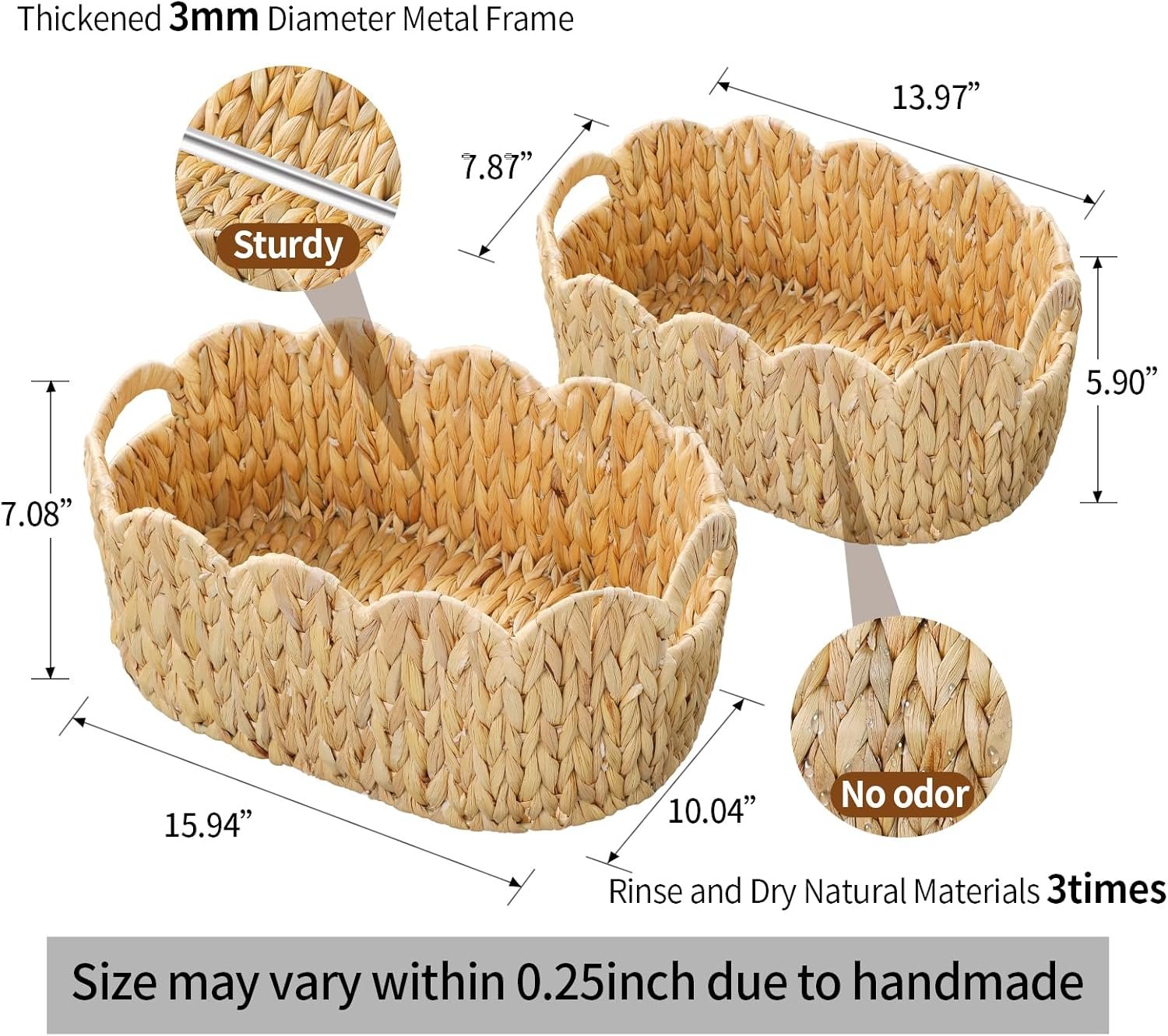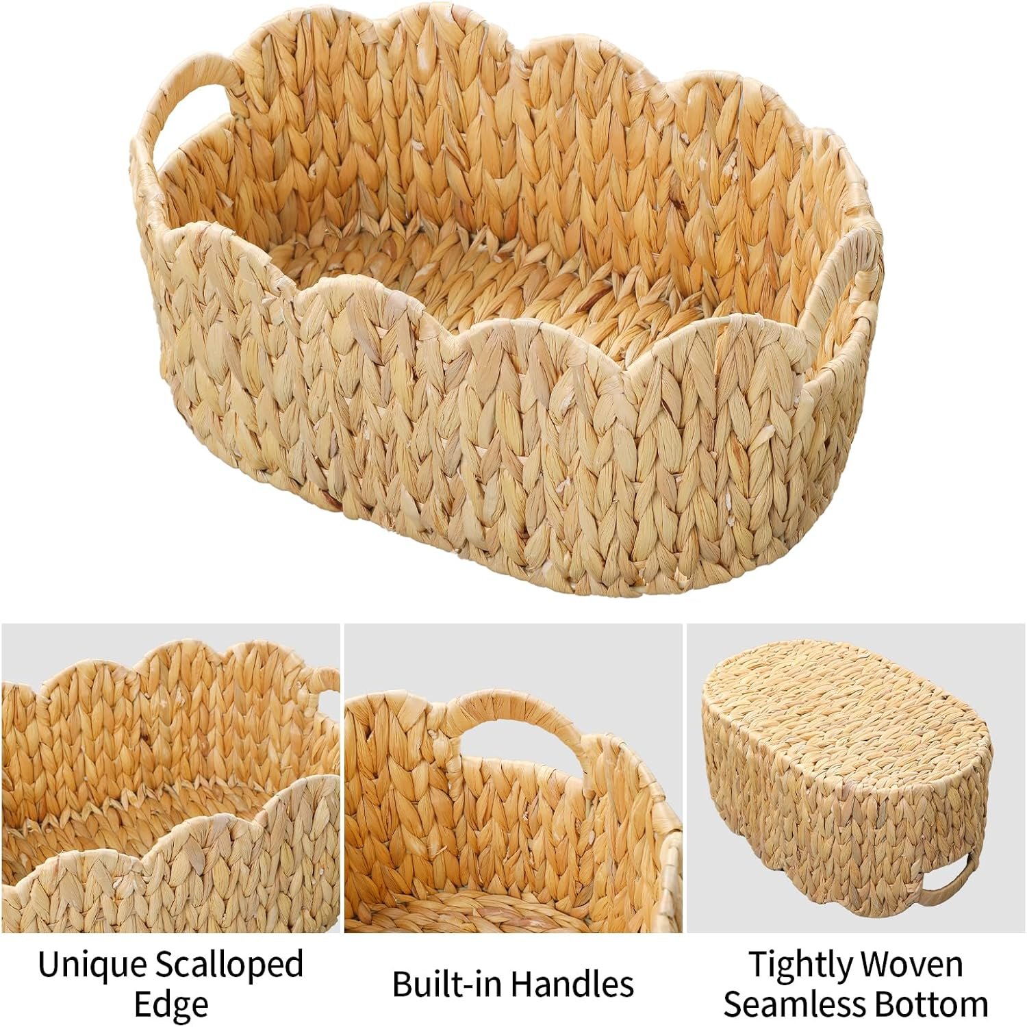 Two Piece Hand Woven Scalloped Water Hyacinth Baskets with Built In Side Handles