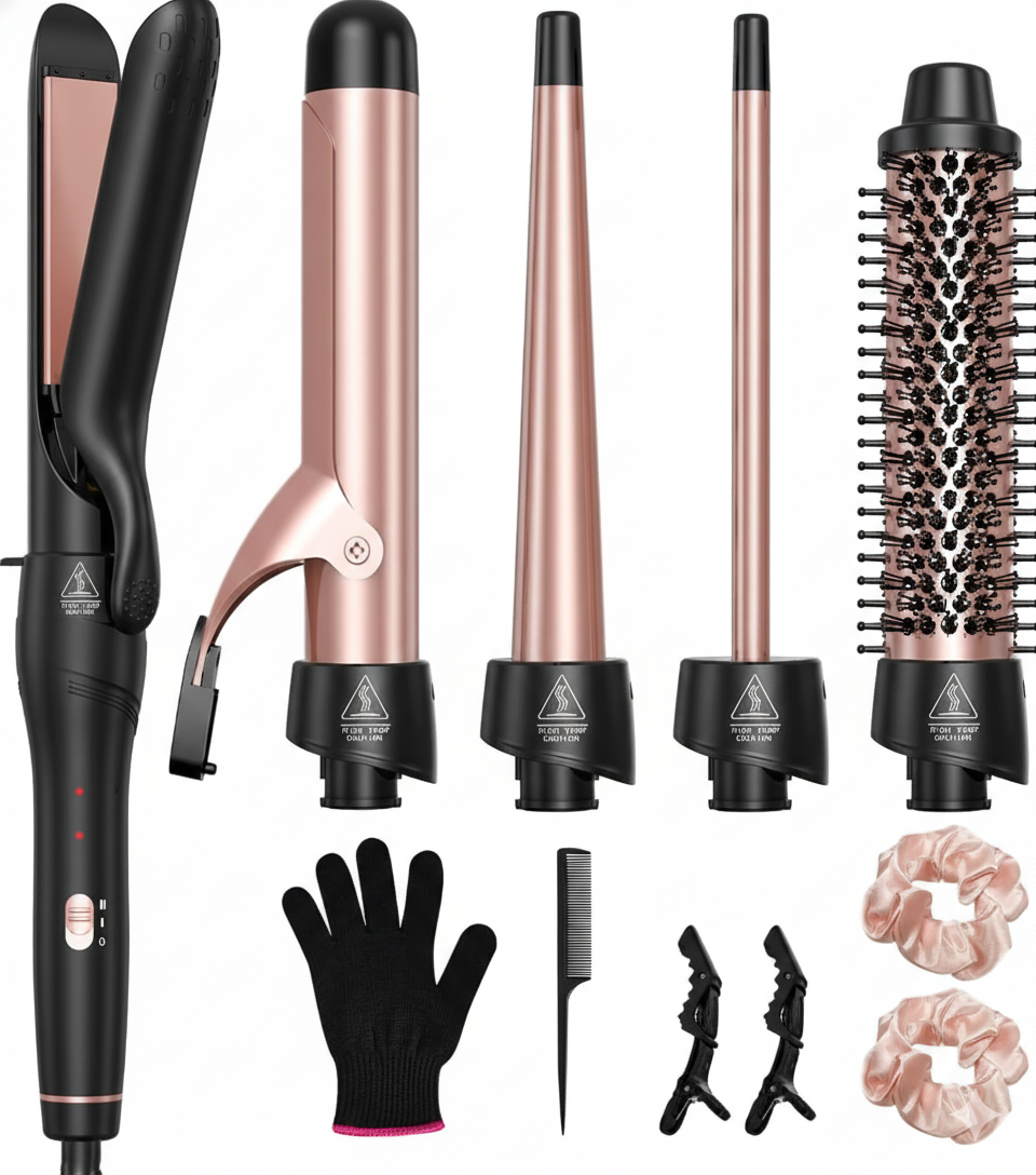 Versatile 5-in-1 ceramic styling set with interchangeable barrels, thermal brush, and flat iron.