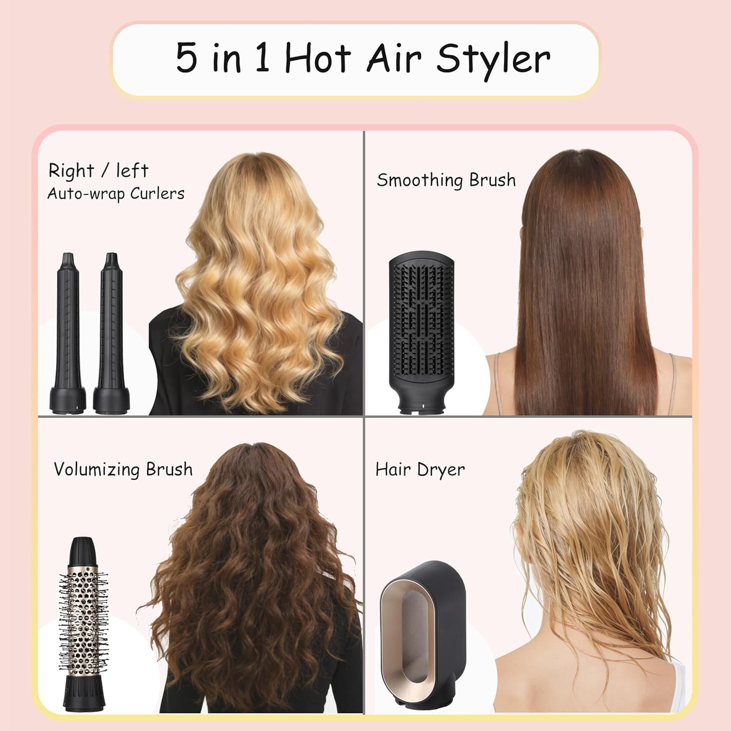 Versatile 5-in-1 Design: Combines drying, curling, smoothing, and volumizing into one system with interchangeable attachments for any hairstyle.
