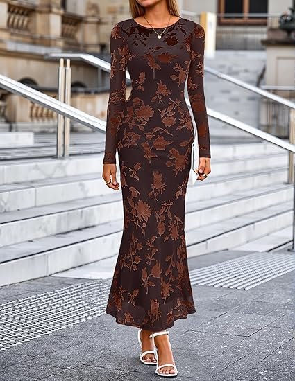 Design: Floral velvet pattern, long sleeves, maxi length, ruched sides