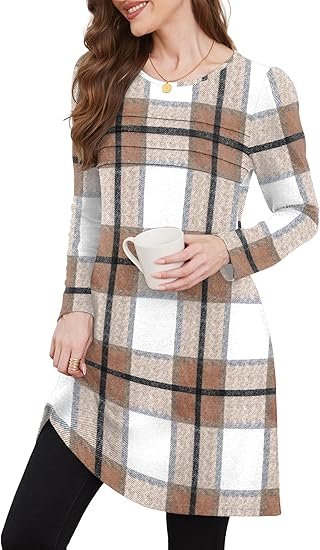 Design: Long sleeves, pleated front, crew neck, tunic style